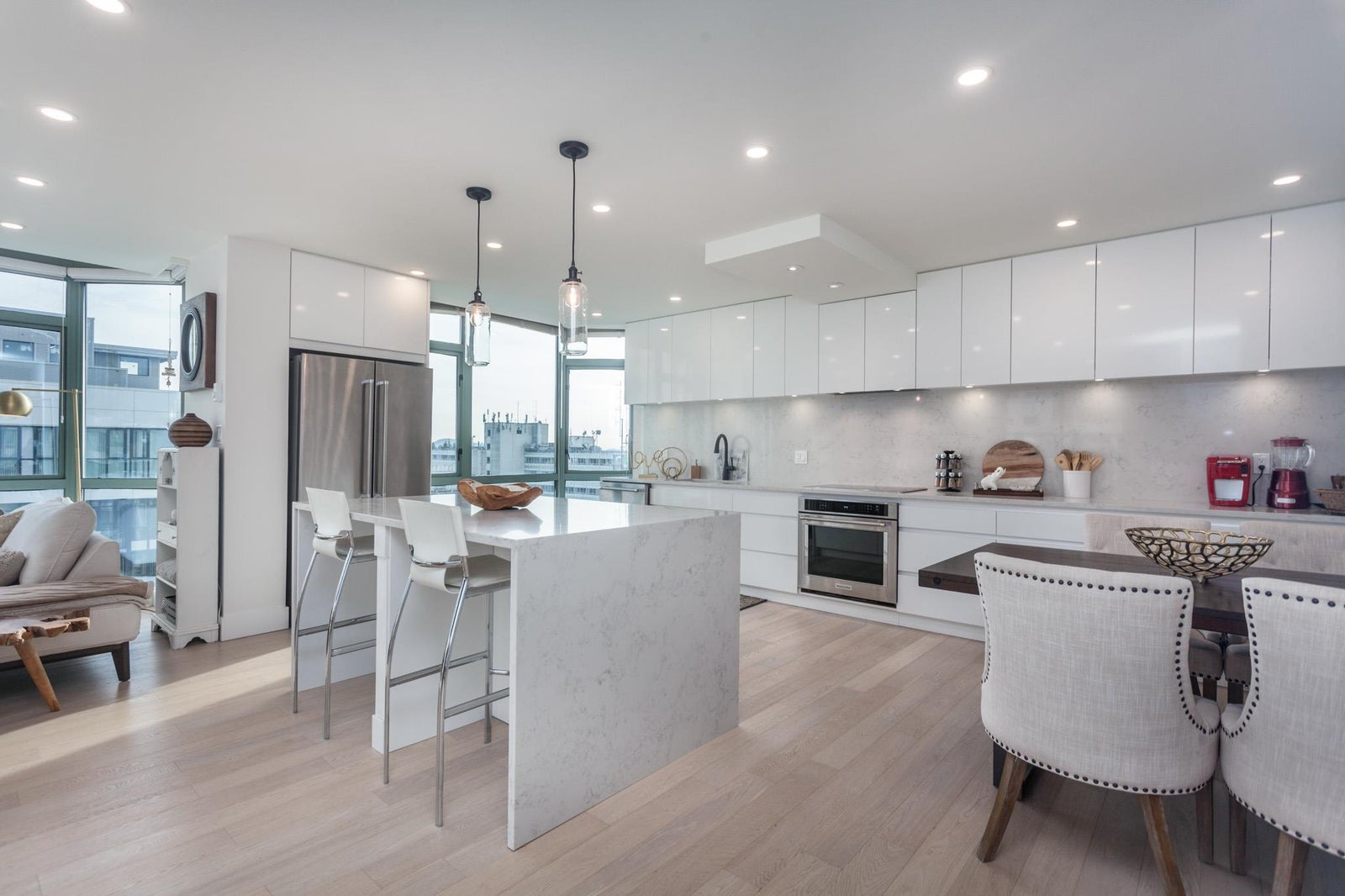 Fully renovated PENTHOUSE at Springhill Place with gorgeous mountain and water views from the kitchen. This suite has over 1,175 sf. of bright living space with floor to ceiling windows and beautiful White Oak Hardwood flooring. Kitchen is a chef’s dream offering plenty of custom cabinetry, large island, quartz countertops KitchenAid appliances, convection oven and induction cooktop. Oversized primary bedroom offers his/her closets and 5 piece ensuite bathroom. Tasteful matte black fixtures, LED mirrors, designer lighting, up to 9’ ceilings, 135sf balcony, and only 3 units per floor. 2 side by side parking spots and one oversized storage locker. Open House: Friday, April 17th 5-6:30pm (Wine & Cheese Event).